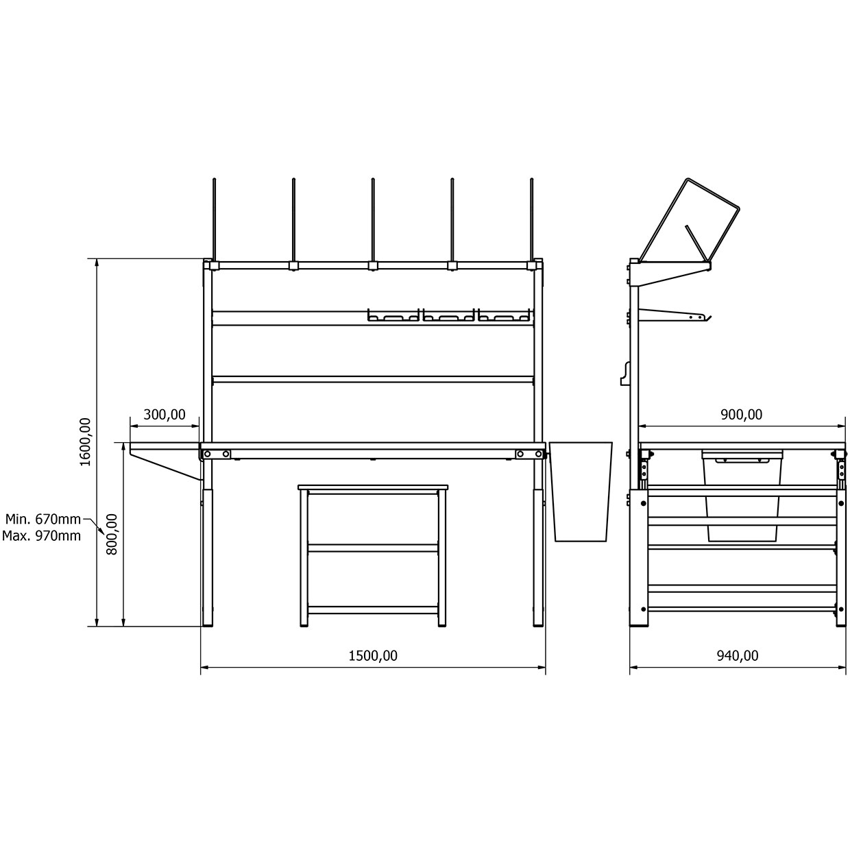 - Yükseklik Ayarı: Manuel olarak ayarlanabilir. Tabla yüksekliği zeminden 670 mm ile 970 mm arasında ayarlanabilir
