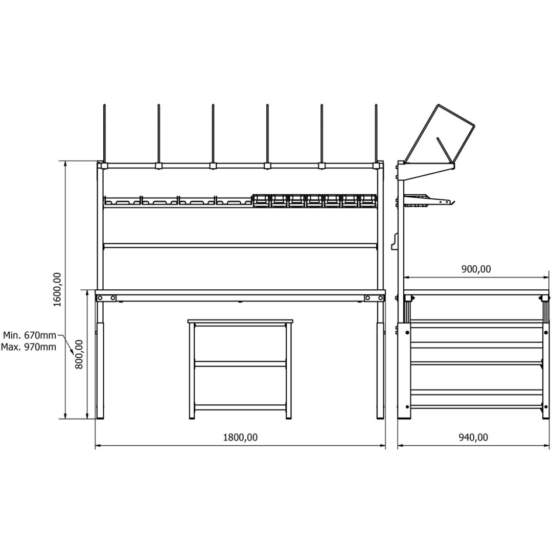 • Yükseklik Ayarı: Manuel olarak ayarlanabilir. Tabla yüksekliği zeminden 670 mm ile 970 mm arasında ayarlanabilir