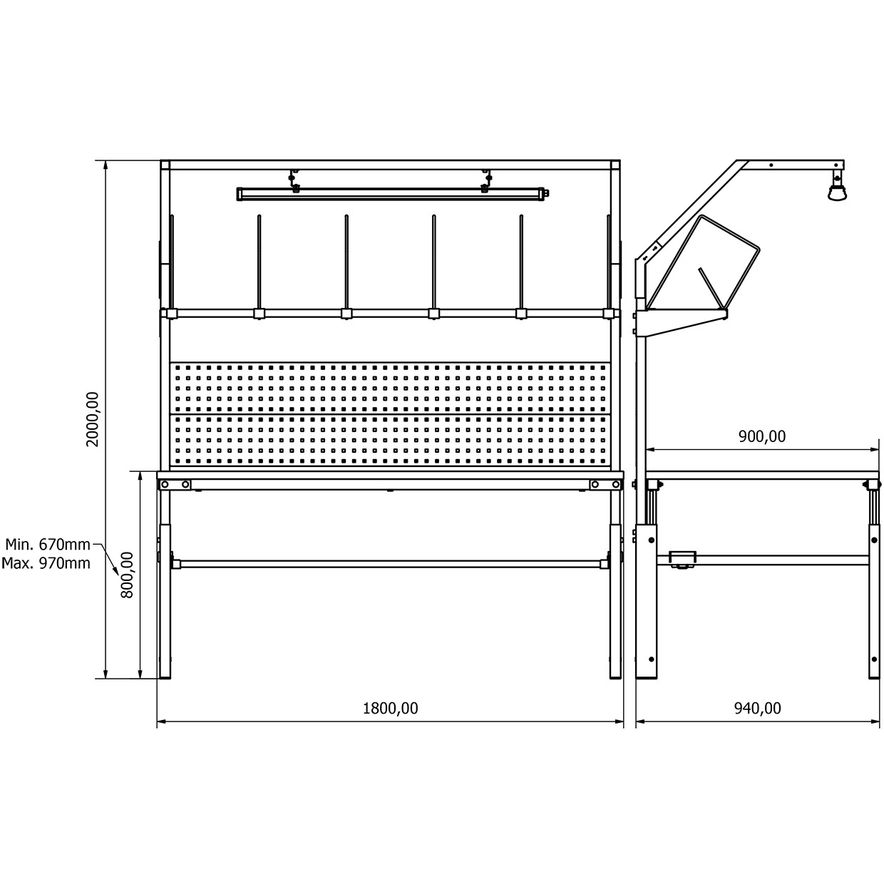 - Yükseklik Ayarı: Manuel olarak ayarlanabilir. Tabla yüksekliği zeminden 670 mm ile 970 mm arasında ayarlanabilir