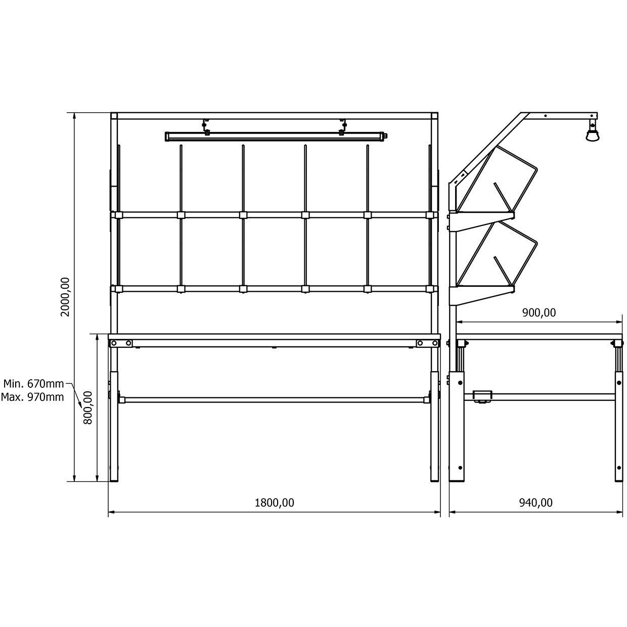 • Yükseklik Ayarı: Manuel olarak ayarlanabilir. Tabla yüksekliği zeminden 670 mm ile 970 mm arasında ayarlanabilir