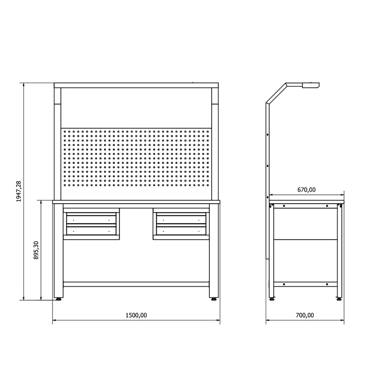BD.36.80.11 Ecoline Çalışma Tezgahı, geniş çalışma alanı ve sağlam yapısıyla küçük, orta ve büyük ölçekli işletmeler, atölyeler ve oto servisleri için ideal bir seçenektir. Tezgah, 1950x1500x700 mm boyutlarında olup, aksesuarlar hariç 97 kg ağırlığındadır.