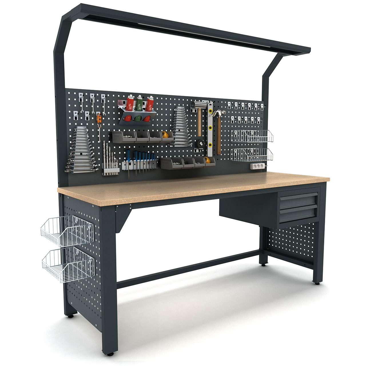 Tezgahın temel özellikleri arasında, H675xW1850xD30mm ölçülerinde delikli pano ve W2000xD670 mm boyutlarında 30 mm kalınlığında HAM MDF tabla bulunmaktadır. Bu özellikler, kullanıcıların geniş bir çalışma alanında rahatça çalışmalarına imkan tanır. LED aydınlatma (Led Armatür 1200) özelliği, kullanıcıların işlerini net bir şekilde görmelerini sağlar ve çalışma verimliliğini artırır.